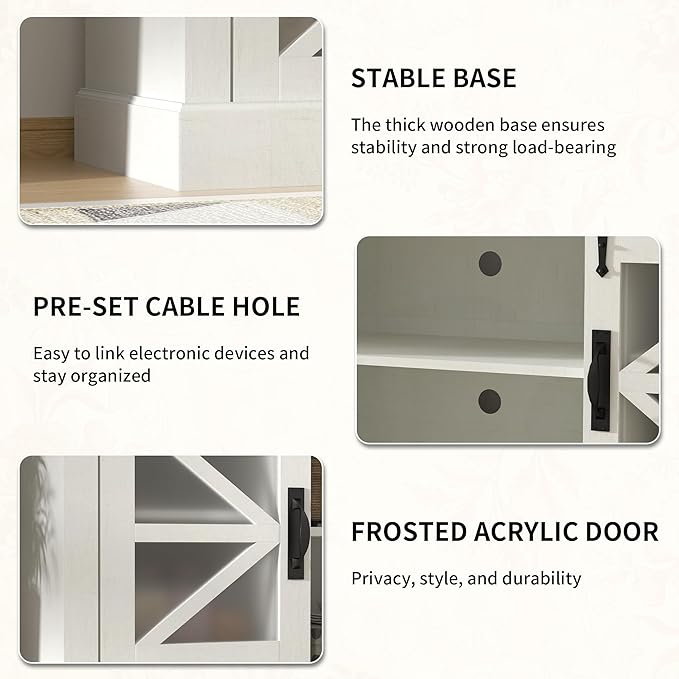 - 【Convenient Sliding Door Design】Say goodbye to the cumbersome operation of traditional cabinet doors. This TV stand is equipped with smooth-sliding barn doors. The unique translucent acrylic panels on the doors allow you to easily see the stored items without opening them, saving space and providing practical convenience. This design keeps your living room tidy and organized at all times.