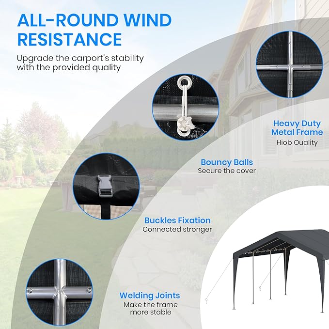 - 【Heavy Duty Stability Frame with 8 Legs】-This carport shelter is constructed with a heavy-duty rust-resistant galvanized steel frame that prevents rust, and corrosion. Featuring 8 legs comprising thick steel poles, along with 4 sturdy windproof ropes and 16 ground stakes make the whole metal carport 12x20 more stable and can be safe from harsh weather conditions