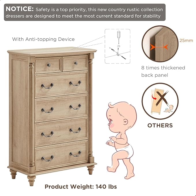 - DURABLE & STURDY: The bedroom dresser is made from FSC-Certified wood for long-term use, scratch-resistant. No strong odor. It's made of premium P2 manufactured wood with a distressed neutral finish of your choice. Each drawer holds up to 25 lbs, and the thickened table surface can support up to 100 lbs