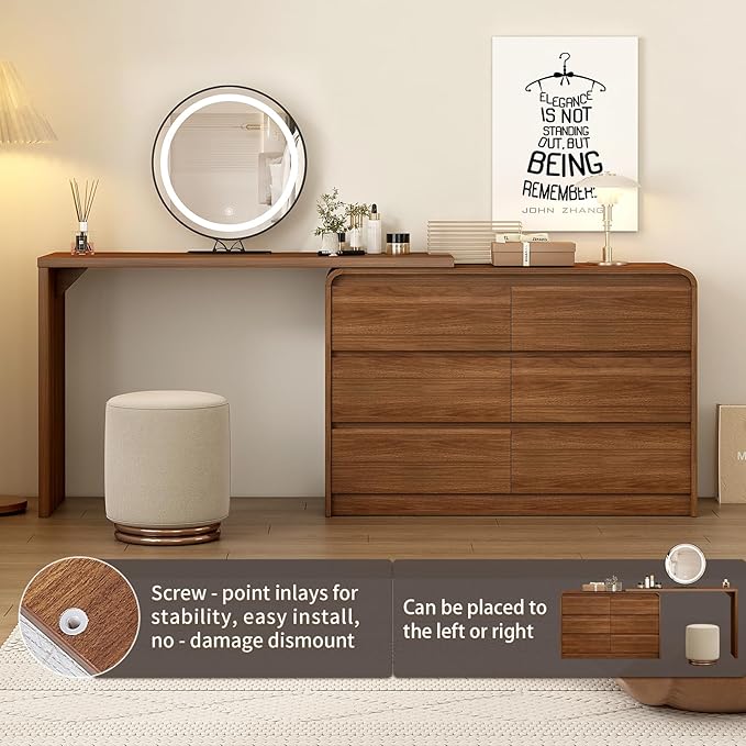 Makeup Vanity Desk with Full Aluminum HD Lighted Mirror, 50-90in Extendable Modern Vanity Table Set with Chair, 6-Drawer Storage Cabinet with Rounded Corners, Bedroom Dressing Table, Brown