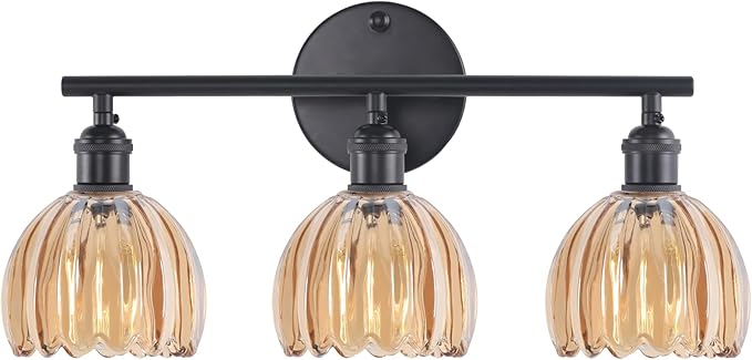 Bathroom Light Fixtures, 3-Light Black Vanity Wall Light Over Mirror with Amber Tulip Glass Shade for Bedroom Living Room
