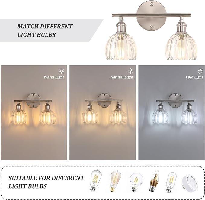 Bathroom Light Fixtures, 2-Light Vanity Wall Light Over Mirror with Clear Tulip Glass Shade for Bedroom Living Room, Satin Nickel