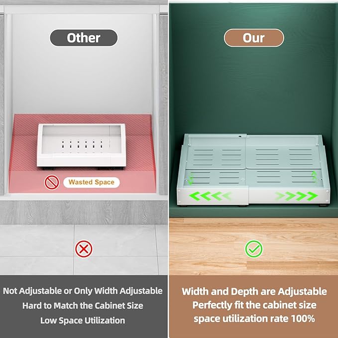 - Wider & Deeper Adjustability:Our pull-out cabinet organizer features 4-way adjustable sizing, extending from 11.4" to 18.9" in width and 16.3" to 21.6" in depth, ensuring a perfect fit for most base cabinets. Unlike standard organizers with limited adjustability, this versatile design adapts to your storage needs, whether for pots, pans, spices, or small appliances.
