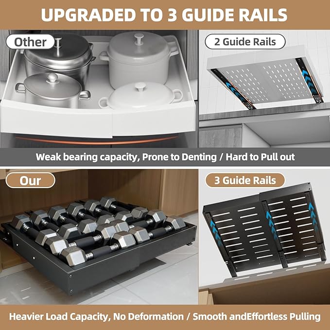 - Heavy-Duty 5-Slide Rail System:Engineered with 5 reinforced slide rails (3 bottom + 2 side), this organizer provides exceptional weight capacity and ultra-smooth movement, even when fully loaded. The dual side rails enhance stability and prevent wobbling, while the 3 bottom rails distribute weight evenly for durable, long-lasting performance.