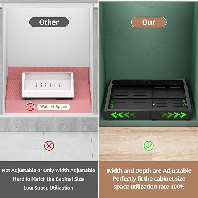 - Wider & Deeper Adjustability:Our pull-out cabinet organizer features 4-way adjustable sizing, extending from 11.4" to 18.9" in width and 16.3" to 21.6" in depth, ensuring a perfect fit for most base cabinets. Unlike standard organizers with limited adjustability, this versatile design adapts to your storage needs, whether for pots, pans, spices, or small appliances.