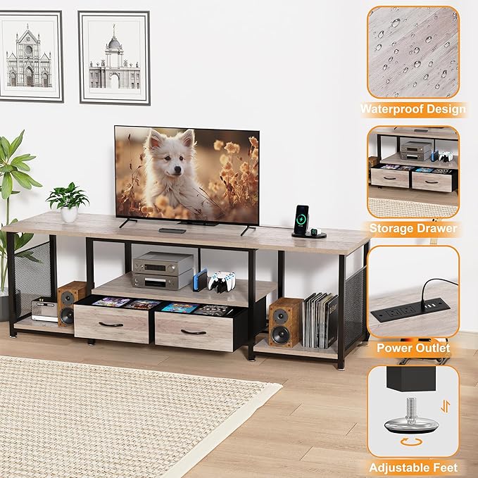 TV Stand with Drawers and Power Outlets for 75 70 65 Inch TV, Entertainment Center with Open Storage Shelves, Media Industrial TV Console Table for Living Room Bedroom Office, Greige