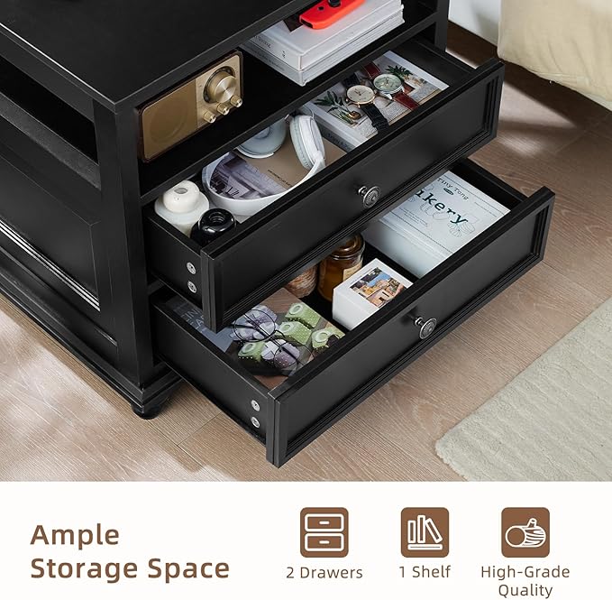 - [Large Storage Space]This side table with charging station has a spacious 24" tabletop, an open compartment, and large-capacity double drawers, combining functions of storage and display. You can organize high-frequency items or decorations in an orderly manner and enhance the style of your bedroom.