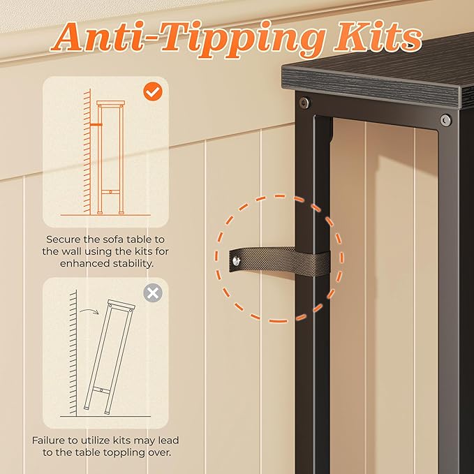 - 【Strong, Stable & Safe】Made from high-quality engineered wood and a sturdy metal frame, this behind the sofa table is built for daily use. Anti-tip kit included for wall-mount safety, plus upgraded larger adjustable feet keep it steady on uneven floors, much more stable than smaller leg bases