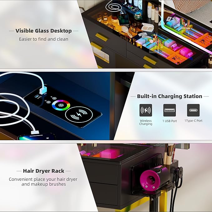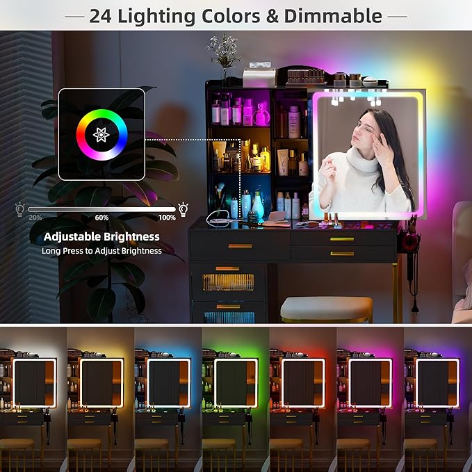 - 【RGB Color Lighting】This vanity desk features 24 static and 7 dynamic RGB modes.You can adjust the multiple colors or brightness according to different scenes and match your different makeup needs