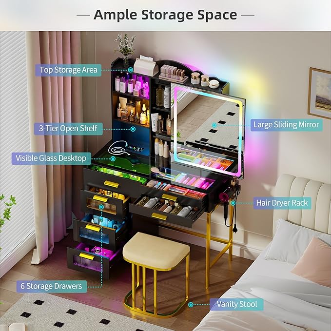 RGB Vanity Desk with Sliding Mirror and Lights,Makeup Vanity with Charging Station,LED Vanity Table with Glass Top,Girls Vanities Dressing Table Set with Stool&6 Drawers for Bedroom(Black