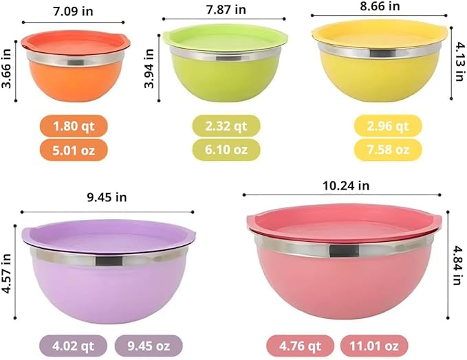 - π§ Stainless Steel Durability with Lids - Made from high-quality stainless steel with colorful non-slip bottoms and matching lids. Great for prepping, mixing, storing, and serving β all in one versatile set