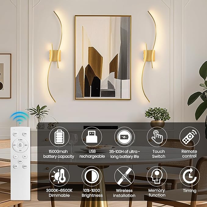 - BATTERY OPERATED WALL SCONCES - With a sleek, modern design that blends into any interior space, these gold battery operated wall lights blend into any indoor space, providing functionality and style. There is no need for wiring or an electrician, which can cut down on a lot of costs. Perfect for renters or those who avoid complicated wirin