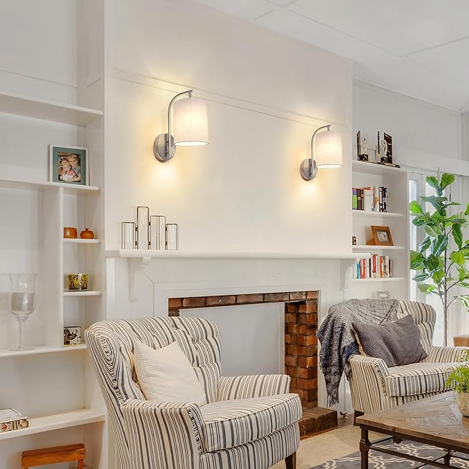 - Wide Application of Stylish Wall Lighting--Crafted from exquisite metal with a solid-hued metallic finish, this dimmable wall sconce features a simple design and a drum-shaped linen shade, offering a stylish aesthetic and warm glow. Perfect for bedrooms, living rooms, staircases, hallways, kitchens, and more, this wall mounted lamp complements any traditional decor or color scheme.