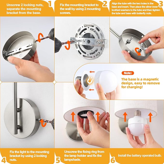 - Rechargeable Bulbs Included--This 2-pack indoor cordless wall sconces come with two E26 bulbs with enhanced magnetic capabilities and detachable charging. Simply remove and charge them using the provided Type-C cable. The bulbs fully charge in 2.5 hours and offer up to 40 hours of runtime. The LED bulb features 3 color temperatures (Warm, Warm White, and Daylight White), 12 RGB colors, and 2 dynamic modes, allowing you to create various atmospheres to suit your daily needs.