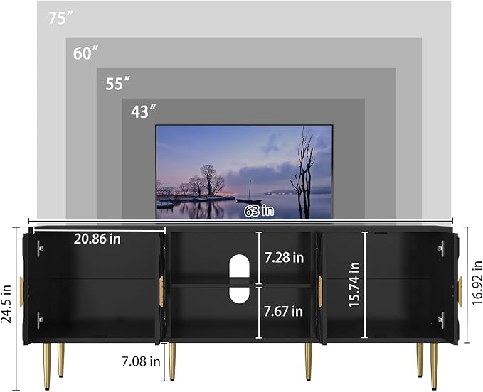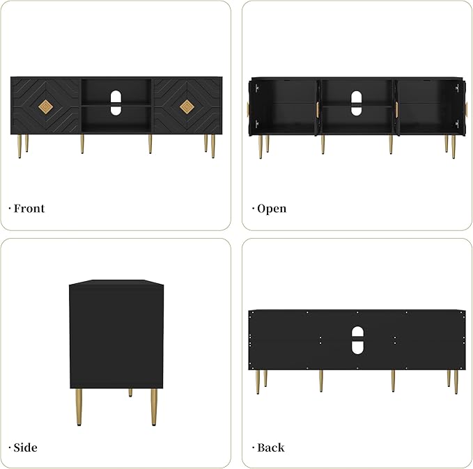- 【Sturdy and Safe】This tv stands for living room is made of P2 class MDF boards and lead-free environmentally friendly paint. The special waterproof coating makes the surface smooth for easy cleaning. The 6 heavy-duty gold legs are made of solid wood for added weight-bearing capacity.