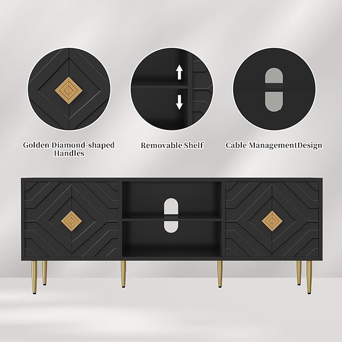 HLR 63''Modern Black TV Stand for 65/70/75 inch TV, Entertainment Center with Storage Cabinet, Mid CenturyTV Console,Embossed Pattern TV Stand, TV Media Console for Living Room, Bedroom