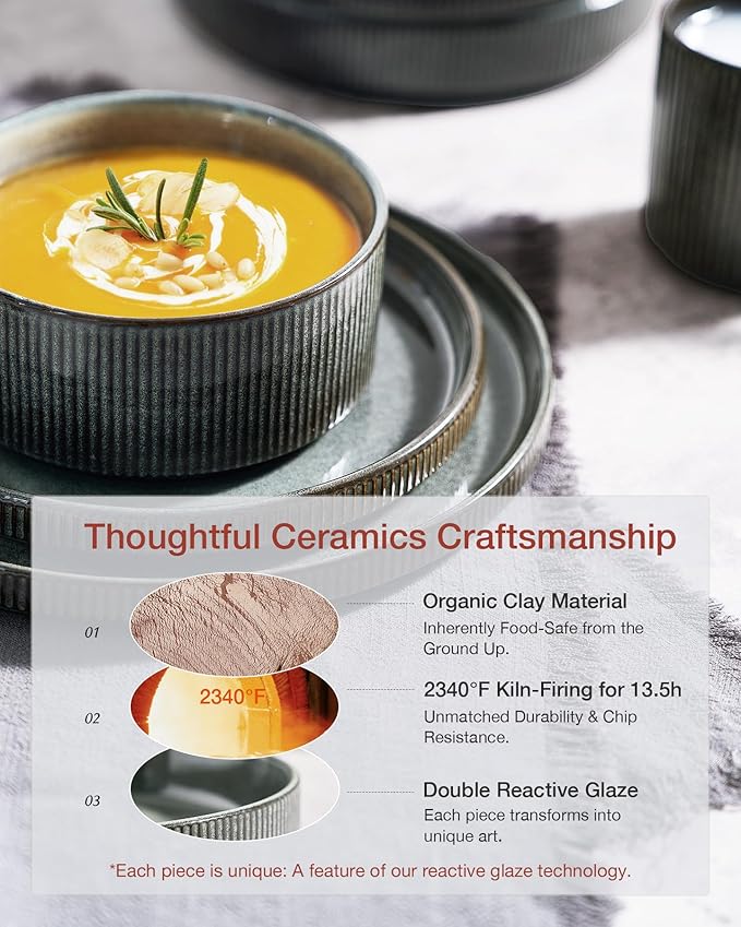 - [Everyday dinnerware]: Our premium stoneware dinnerware crafted from organic and natural clay, is LEAD-FREE and CADMIUM-FREE. It ensures safety for both your family and the environment. You can savor all kinds of meals, including steaks, salads, and desserts, with complete confidence