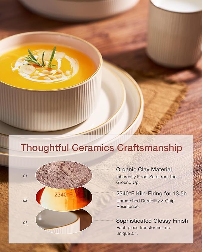 - [Everyday dinnerware]: Our premium stoneware dinnerware crafted from organic and natural clay, is LEAD-FREE and CADMIUM-FREE. It ensures safety for both your family and the environment. You can savor all kinds of meals, including steaks, salads, and desserts, with complete confidence