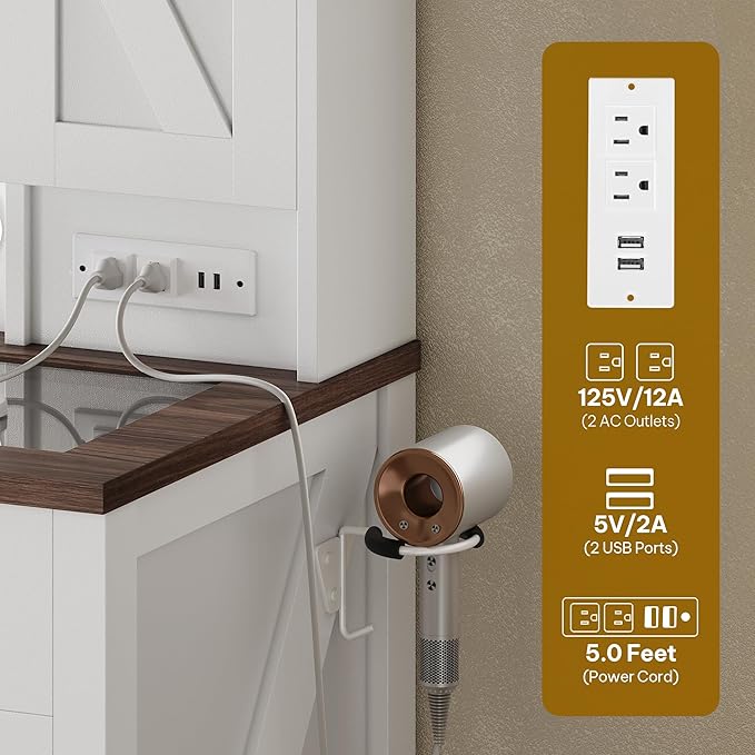 - Integrated Power Strip and Hairdryer Holder: Say goodbye to the hassle of limited outlets. This vanity table is equipped with two USB ports and two power outlets, making it easy to keep all your devices charged. The convenient hairdryer holder ensures your styling tools are always within reach, ensuring you start each day looking your best