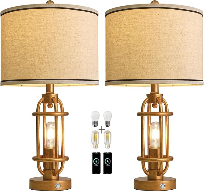 23.75'' Table Lamps Set of 2 for Living Room Bedroom Industrial Farmhouse Metal Touch Lamps with USB A+C Ports, Night Light Vintage Nightstand Bedside Lamp, Bulbs Included, Antique Gold