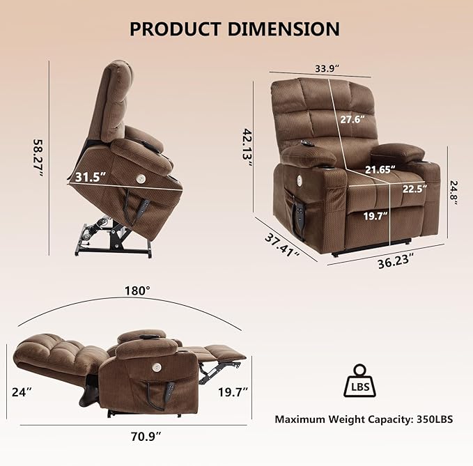 - Comfortable Upholstery: The high-density sponge and high-quality metal filling of this oversized recliner chair ensure the high quality of the chair. So the recliner lift chair is sturdy enough to withstand a weight of 350 pounds. The soft and comfortable corduroy fabric of the lift chairs for elderly will bring you a comfortable tactile experience.
