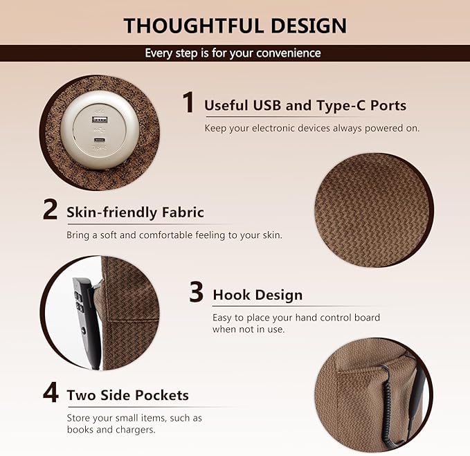 - Massage & Heating: Our corduroy recliner has a total of 8 vibration points and 1 waist heating point. To help you relax after a day of work. Both functions can be turned off at a fixed time of 15/30/60 minutes (heating function and vibration function work separately).