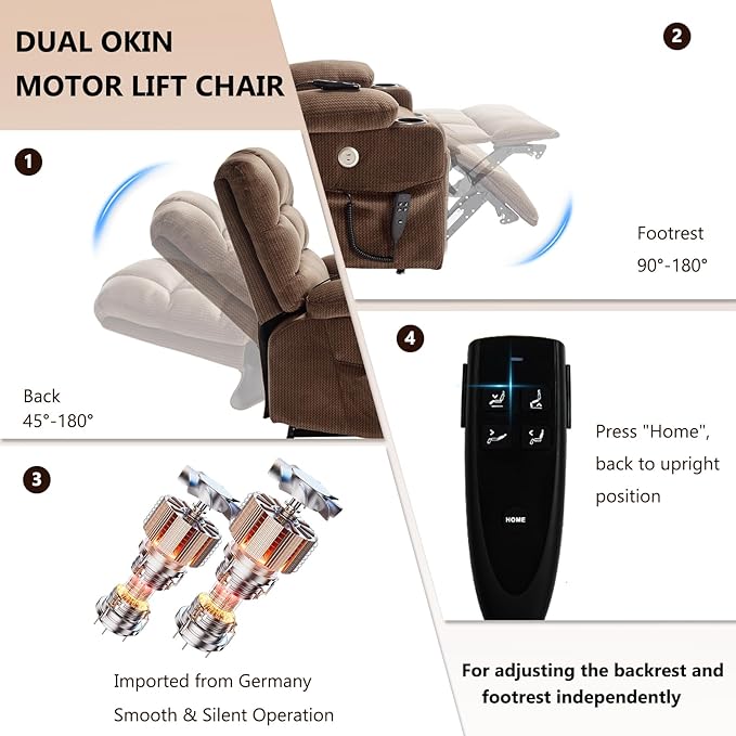 - Extra Wide Recliner: With the help of built-in dual motors, the backrest and footrest of the oversize recliner chair can work independently through our control panel. This means you can adjust the plush recliner to any position you want. (Maximum tilt angle: 180 °, Seat Width: 22.5", Length: 70.9")