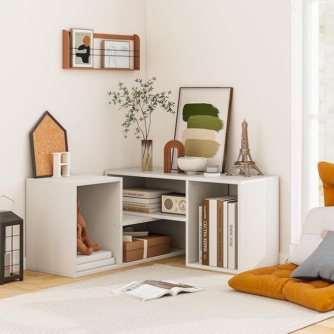 - 2PCS Modular TV Stand: 2 L-shaped shelves can be configured in multiple ways: 1) Free expansion: Adjust the length according to your TV size. 2) Free combination: Stack together to be used as bookshelf. 3) Free rotation of 180°: Configure as a versatile corner unit.