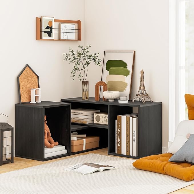 - 2PCS Modular TV Stand: 2 L-shaped shelves can be configured in multiple ways: 1) Free expansion: Adjust the length according to your TV size. 2) Free combination: Stack together to be used as bookshelf. 3) Free rotation of 180°: Configure as a versatile corner unit.
