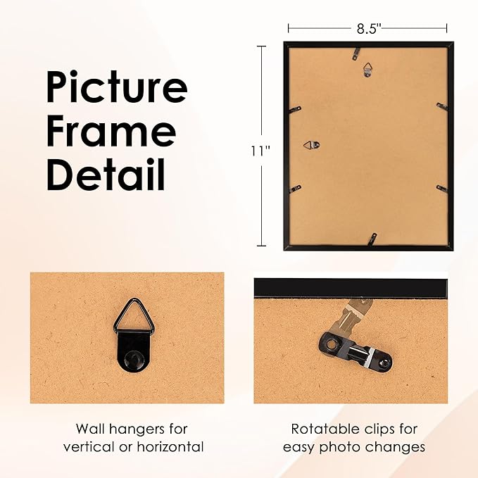 - Versatile Display: The 8.5x11 picture frames can showcase 8.5x11 photos without a mat, or with a mat, they can accommodate 5x7 photos, allowing you to layer and enhance the visual appeal of your pictures.Cherish your special memories and create a personal gallery that reflects your unique style and personality.