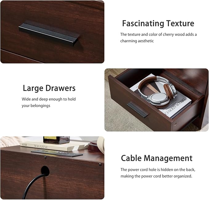 - NIGHTSTAND WITH CHARGE STATION: The LIDYUK bedside table comes with charing station, making it easy to charge your devices without being tethered to wall outlets. The power station features 2 plugs and 2 USB ports, ideal for keeping your appliances and gadgets powered