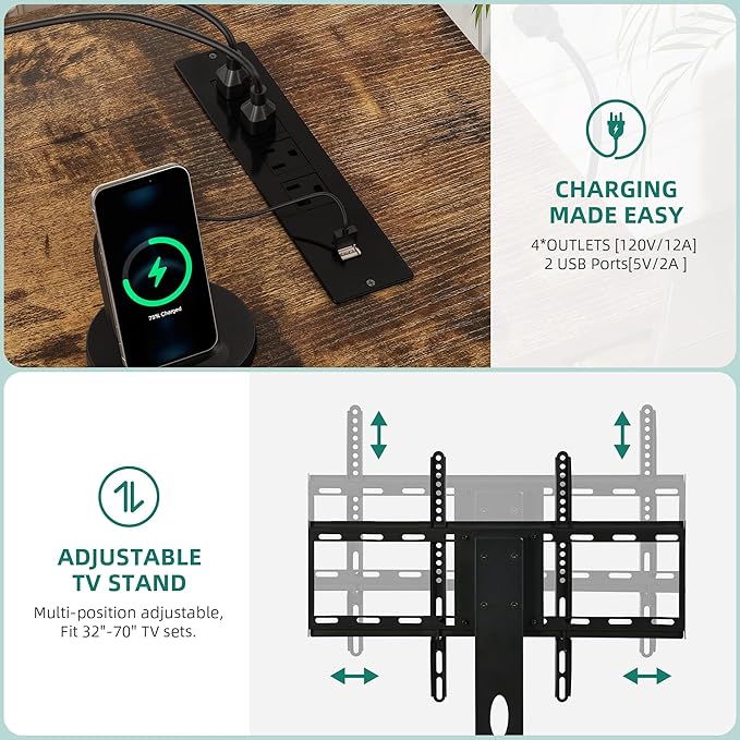 - Power Outlets at Your Command: Our TV stand features a built-in power center with 4 AC outlets and 2 USB ports, conveniently located right on the tabletop. Keep all your entertainment devices charged and ready to go, without the clutter