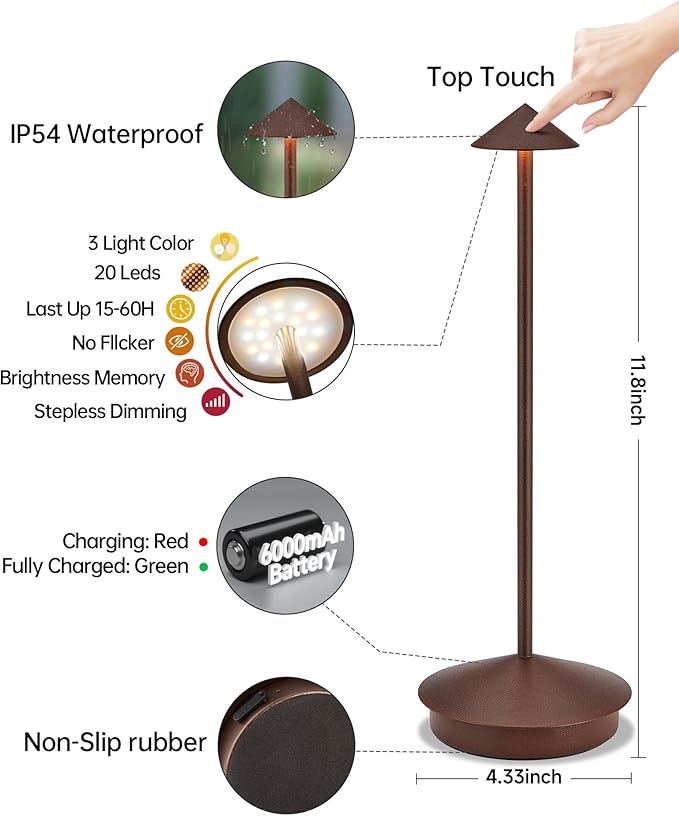 • 【Sincere and Reliable After-sales Service】Mordern Cordless Led Table Lamp,Thick material and anti-slip pads on the base make it not easy to be blown over by high winds, and the silicone plug at the charging port prevents water and dust from attacking it, which is perfect for outdoor use. We provide you with long-term after-sales guarantee, if you have any questions please feel free to send us an email through Amazon, we will give you a satisfactory solution!