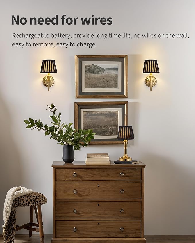KDG Cordless Wall Sconces Set of 2, Small Wireless 5200mAh Rechargeable Battery Fabric LED Wall Lamps, Portables Lightings for Wall Painting, Living Room, Bedroom, Hallway, Gifts (Black Lampshde)