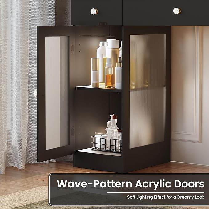 - Durable Vanity & Easy Assembly: Our makeup table is crafted from high-quality wood panels and features silent ball-bearing slides for no noise and smooth operation. And the explosion-proof mirror and anti-tip design allow this modern vanity safe, and long-lasting.All parts are labeled, and step-by-step instructions are included to ensure your assembly.