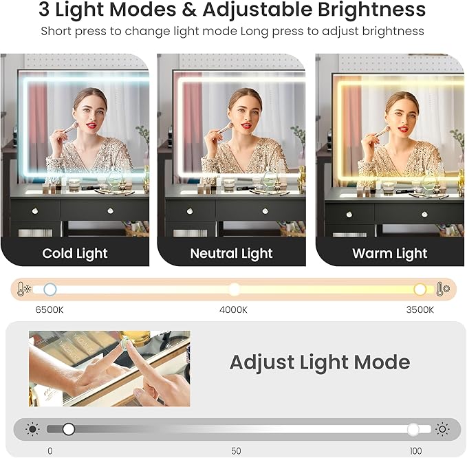 - Lighted Mirror with Adjustable Brightness: Paired with large mirror and lights, this makeup desk has both practicality and aesthetics.The adjustable lighted mirror provides three lighting modes—Cool, Warm, and Natural, ensuring that your makeup looks great in any environment.You can adjust the brightness of light by pressing and holding the button.