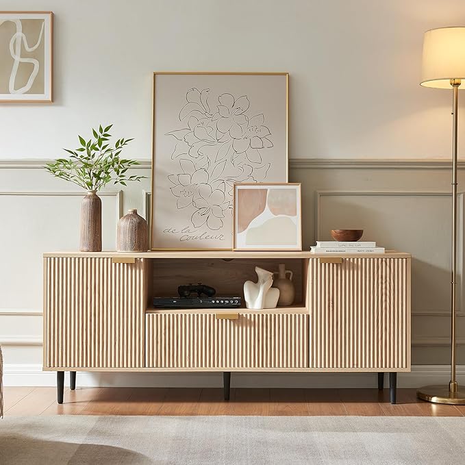 Okvnbjk Modern TV Stand for 65 Inch TV, TV Consoles for Living Room, Media Console with Soft Hinge & Drawer, Wood Fluted Entertainment Center with Storage, Oak