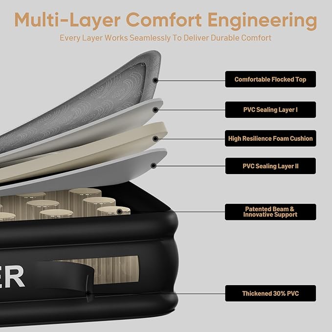- 【Premium Flocked Microfiber & Wrinkle-Resistant Surface】 The surface of this twin blow up mattress Crafted with high-density flocked microfiber, the quilted surface design resists wrinkles while providing a velvety-soft sleeping area. Crafted with multi-layer waterproof construction , VOSSER air mattress twin use thicker PVC material , it's +30% thicker than average brand's product,durability and puncture resistance, offering both comfort and long-lasting performance