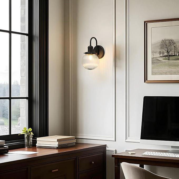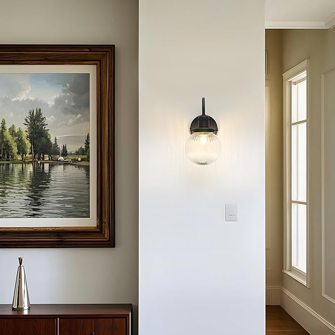Industrial Vintage Gooseneck 1-Light Wall Sconce with 5.9" Round Ribbed Clear Glass Globe Lampshade Indoor Wall Mounted Lamp Fixture for Bedroom Living Room Bathroom Vanity