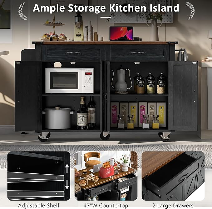 Farmhouse Roling Kitchen Island Cart with Drop Leaf Breakfast Bar with Power Outlet, Storage Island Table on Wheels with Drawers, Spice Rack(Black)