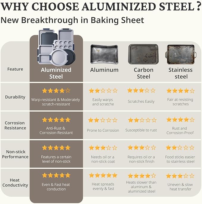 - HEAVY DUTY ALUMINIUM STEEL: Our ceramic bakeware sets non stick are made of 0.6 mm thick heavy duty aluminized steel. The thickened design ensures long-lasting performance. These pans have superior rust and non-stick properties compared to traditional aluminum, carbon steel or stainless steel pans. They can withstand temperatures up to 500°F, ensuring perfectly even results every time you bake.