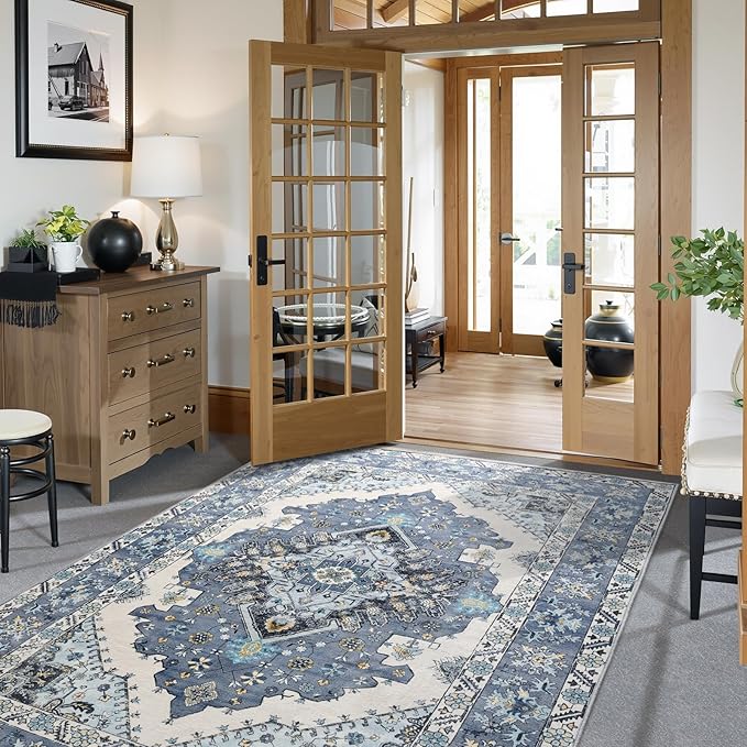 Vintage Area Rug 5x8 Rugs, Machine Washable Vintage Area Rug Non-Slip Low Pile Large Rug for Living Room, Bedroom, Farmhouse, Dining Room, Blue