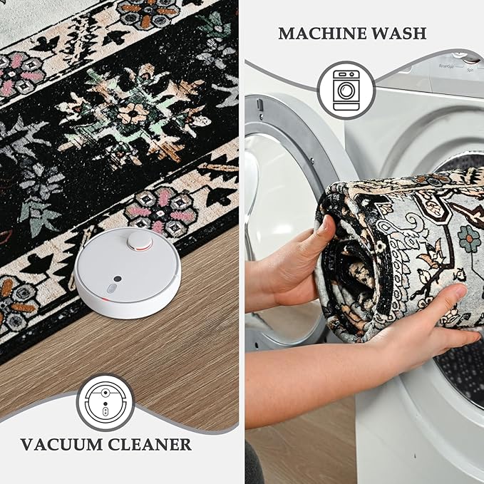 Vintage Area Rug 5x8 Rugs, Machine Washable Rug Non-Slip Low Pile Large Rug for Living Room, Bedroom, Farmhouse, Dining Room, Black