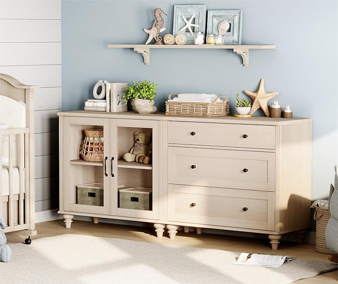 - 【Stable Frame & Use-friendly Detail】Combining high quality materials with exquisite craftsmanship, this coffee bar cabinet is solid enough to hold various kinds of daily essentials and offer long lasting using satisfaction. It must be mentioned that smooth metal slides make the drawers easy to pull out. Weight Capacity of Glass Cabinet: 100 lbs.Weight Capacity of Dresser: 88 lbs.