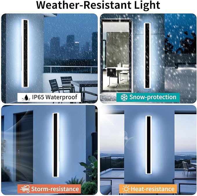 - OUTDOOR LONG WALL SCONCE MULTI-SCENARIO APPLICATION:57inch Black Wall Mounted Outdoor Long Wall Sconce emits soft and bright light from four directions to create different decorative effects. It can be used in various locations such as commercial bedrooms, bathrooms, balconies, theater rooms, hallways, lobbies, front porches, garages, fences and more. Excellent heat and cold resistance, able to withstand harsh weather conditions