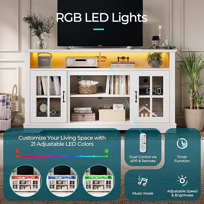 - Ample storage space – At 59 inches long, this white TV stand accommodates TVs up to 65 inches, with ample room for a soundbar or decor. It features a storage cabinet with glass doors and two open shelves, offering plenty of space for game consoles, set-top boxes, and DVD players