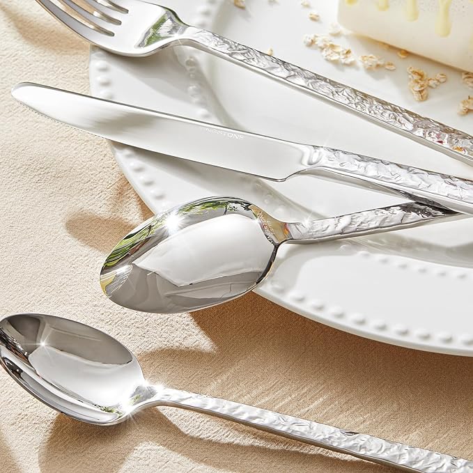 KINGSTONE 60 Pcs Hammered Silverware Set for 12, 18/10 Stainless Steel Heavy Duty Flatware Set, Tableware Cutlery Utensil Sets for Home Restaurant Dishwasher Safe