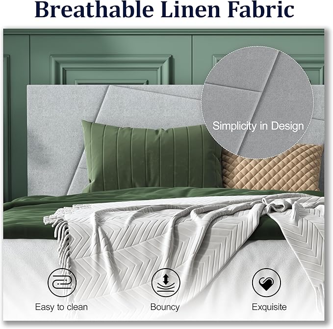 - MODERN SIMPLICITY: The elegant fabric upholstered headboard is both aesthetically pleasing and functional, creating a minimalist focal point for your bedroom while providing comfortable back support.