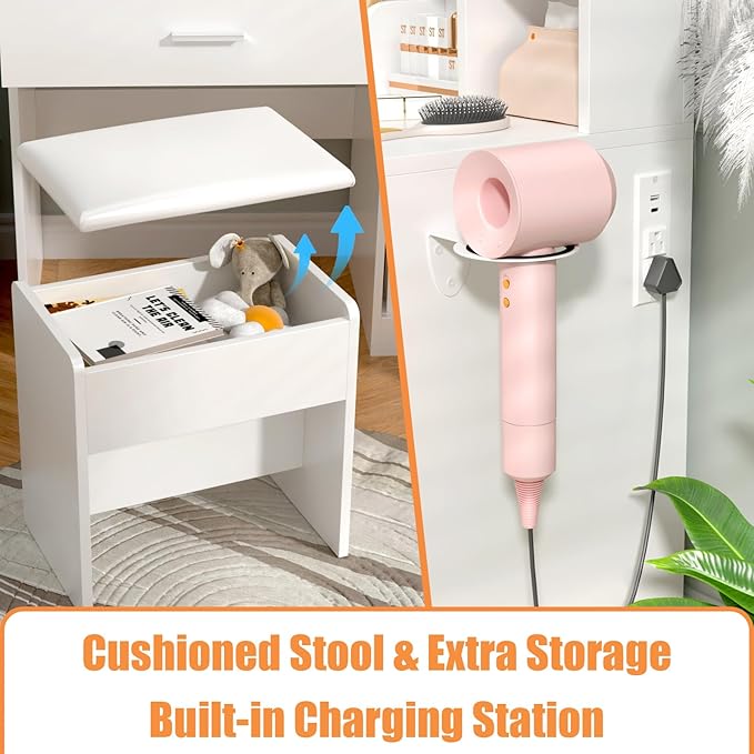 - Power Outlet & Hair Dryer Rack: With 2 AC outlets, 1 USB ports,1 Tyc-b interface and a hair dryer rack, this white vanity desk help you easy access to your hair dryer, cell phone, curling iron and etc. You can do everything at the vanity without having to walk around