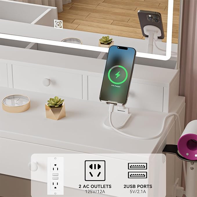 - Premium Vanity Sets: Crafted from durable wood, this white makeup table set is designed with ease of assembly in mind. It includes 2 power outlets, 2 USB ports, a hair dryer rack, and adjustable 3-in-1 LED lights. The large mirror ensures crystal-clear reflections, while the included dream box offers random hair accessories and festive flashing lights as a surprise gift.